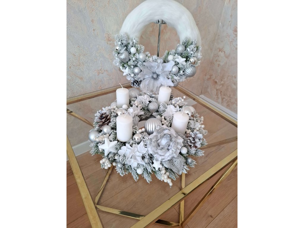 › Vianočné dekorácie › Adventné vence › Bielo-strieborný čečinový adventný svietnik, Bez sviečok