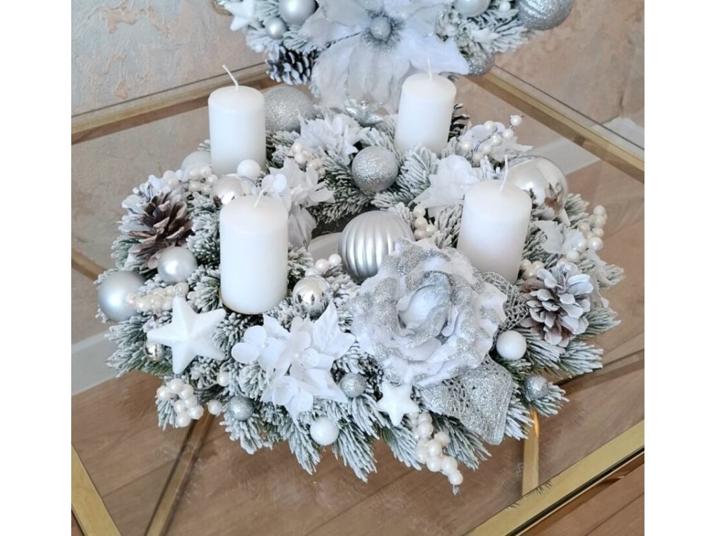 Okrúhly adventný svietnik na sivej kožušinke s bielo-striebornými doplnkami. Sviečky sa nasadzajú na kovové pliešky. Elegantná vianočná dekorácia, ktorá dodá tú pravú vianočnú atmosféru.
