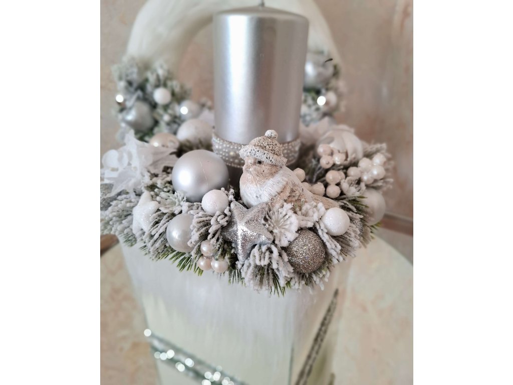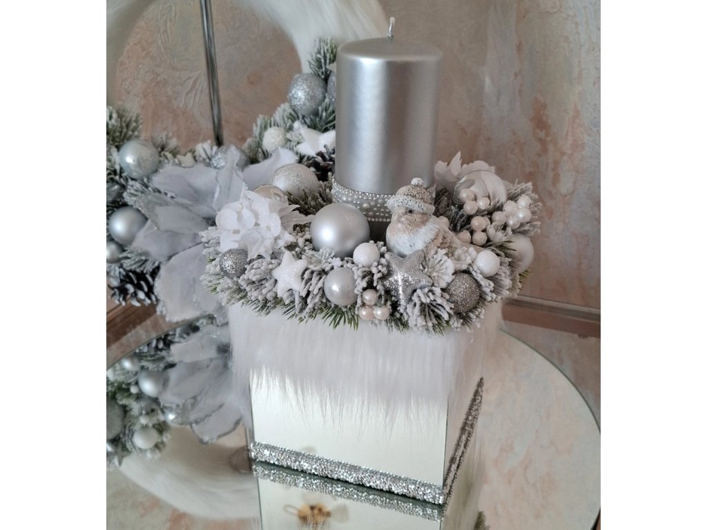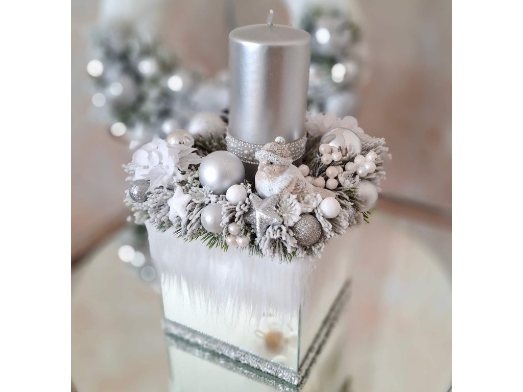 Luxusný vianočný aranžmán so sviečkou na stôl nadekorovaný v zrkadlovej nádobke. Svietnik tvoria bielo-strieborné ozdoby a keramický vtáčik. Elegantná dekorácia, ktorá vnesie tú pravú sviatočnú atmosféru.